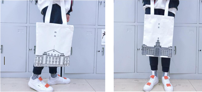 纪念帆布袋是将哈尔滨商业大学北区主楼与南区主楼用版画形式进行设计表现,以帆布袋的形式进行实物效果表达,符合当代当今消费者追求的简约实用的消费理念。