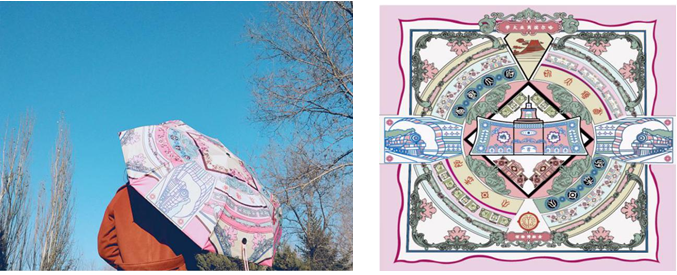 系列纪念丝巾和纪念雨伞以哈尔滨商业大学的标志性建筑物进行图形化,以二方连续的形式进行设计表达,再与哈尔滨商业大学货币金融博物馆珍藏货币的元素相结合设计。
