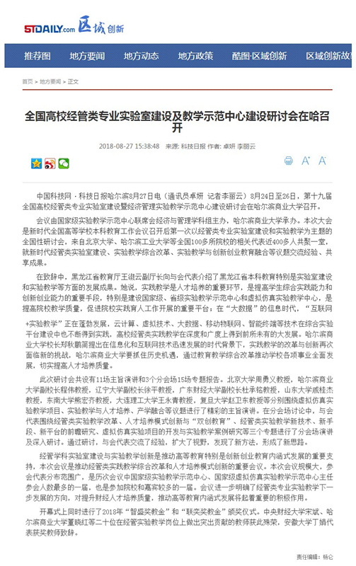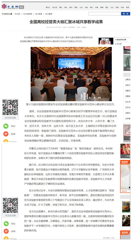 8月24日至26日,由国家级实验教学示范中心联席会经济与管理学科组主办、哈尔滨商业大学承办的第十九届全国高校经管类专业实验室建设暨经济管理实验教学示范中心建设研讨会在哈尔滨召开。教育部高教司实验室处处长高东锋,黑龙江省教育厅副厅长王淑云,黑龙江省教育厅高教处处长蒋鲲,国家级实验教学示范中心联席会副秘书长、北京大学实验室与设备管理部副部长周勇义,国家级实验教学示范中心联席会经管学科组组长、山东大学商学院院长戚桂杰,大会创始人、中国信息经济学会名誉理事长、中国人民大学信息学院教授陈禹等专家、学者出席会议。哈尔滨商业大学校长郑秋鹛在开幕式上致辞,副校长程伟主持开幕式并做主题报告。