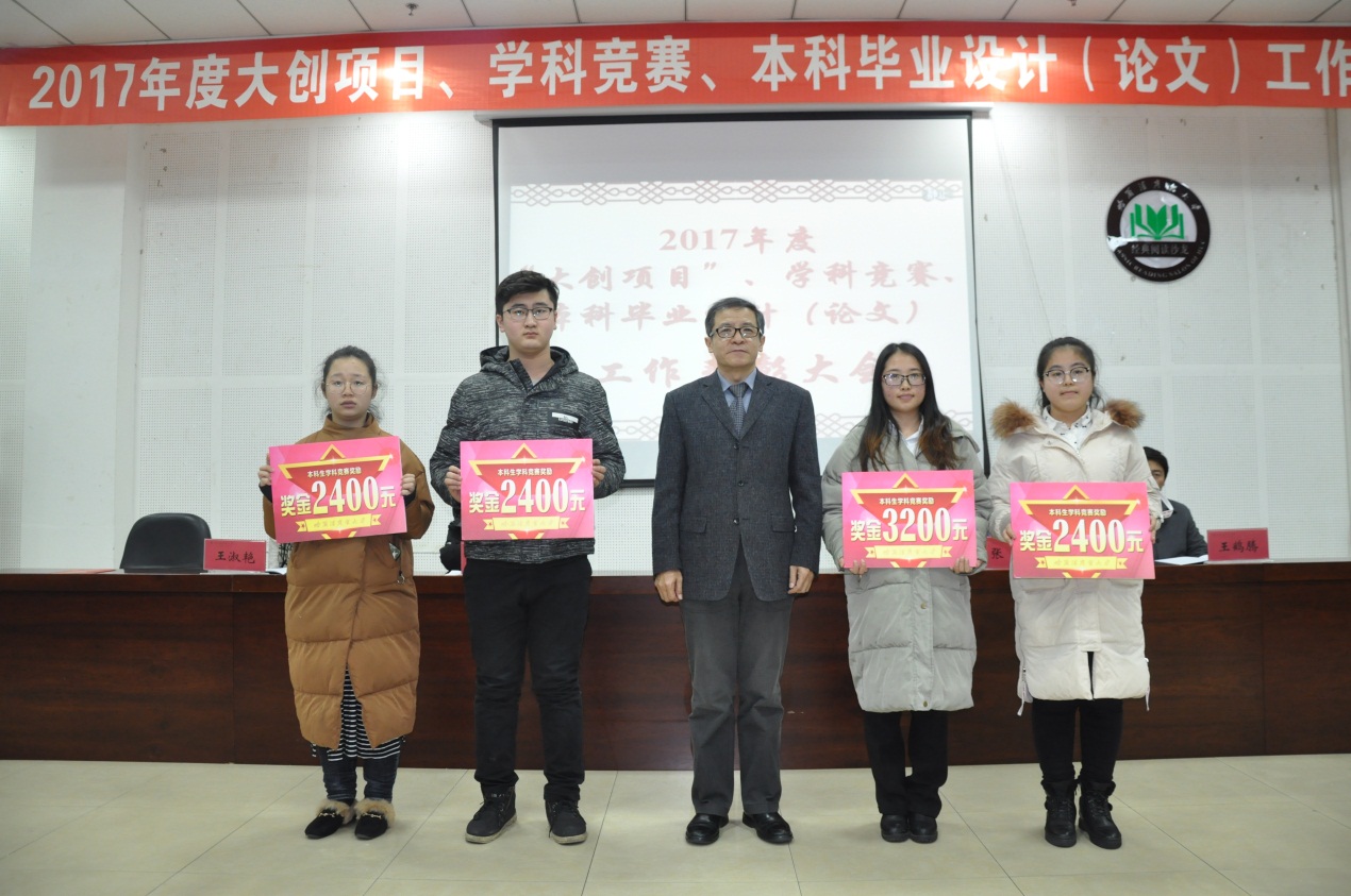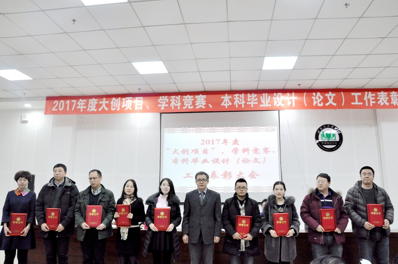 大会表彰了2017年度“大创项目”、学科竞赛、本科毕业设计(论文)等工作中取得突出成绩的优秀工作者,其中“大创项目”管理先进工作者4人,优秀指导教师5人,本科毕业设计(论文)优秀指导教师49人;表彰了2017年全校学科竞赛获奖师生共计65个团队,其中A类国家级二等奖1项,A类省级一等奖11项、二等奖12项;B类国家级特等奖1项、一等奖2项、二等奖11项、三等奖10项;B类省级奖8项。