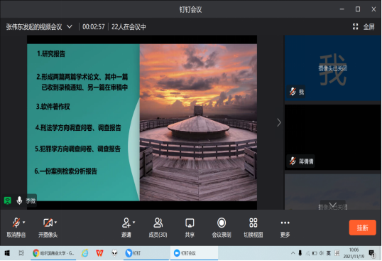 2021年11月19日上午10:00,根据学校大创项目结题通知要求和疫情防控需要,法学院采用线上钉钉视频会议方式进行2020年度大创项目结题答辩会,学院邀请法学院副院长杨姝玲副教授、理论法学教研室主任张伟东副教授、社会工作教研室主任王莉副教授,国际法教研室专业教师尹文希博士,学院科研秘书司丹博士担任项目结题答辩组专家,各项目组全体成员近30余人参加了此次结题答辩汇报会。