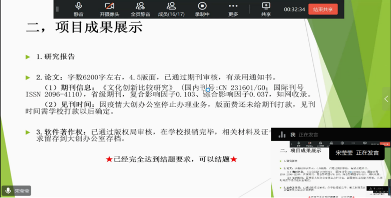 汇报概要:该项目为当前社会新生活背景下汉语方言对英语学习和使用产生的影响和成因分析,根据负责人汇报情况,项目研究的具体内容已呈现至论文且已被省级期刊录用、软件著作权也已经申请成功。该项目已完全达到结题要求,全体评审老师同意结题。