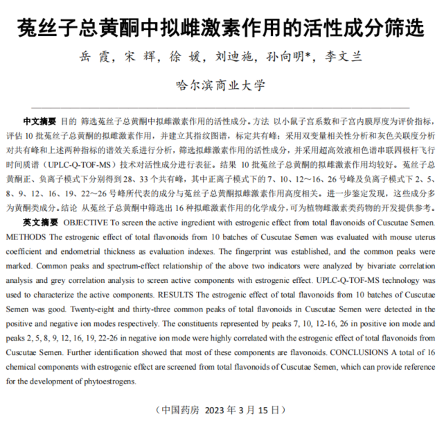 此次国创年会设置了大学生创新学术交流、大学生创业项目推介、大学生创新创业改革成果项目展示等活动。其中从部属高校和地方高校共遴选学术论文200篇进行学术交流。经过学校推荐,黑龙江省教育厅遴选、“国创计划”专家工作组复选,我校由药学院2020级制药工程专业岳霞同学主持,孙向明老师指导的2022年国家级大学生创新创业训练计划项目成果《菟丝子总黄酮中拟雌激素作用的活性成分筛选》成功入选年会交流论文。