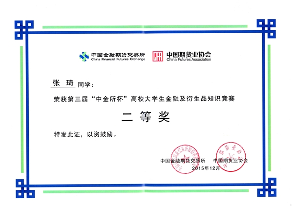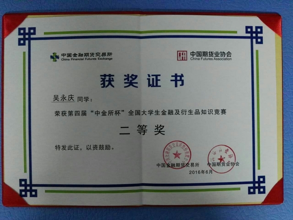 2017年6月11日,第五届“中金所杯”全国大学生金融知识大赛落下帷幕,我院获奖人数创历史最高(前四届获奖人数累计10人),共9人获奖,其中,三等奖5人,优胜奖4人。从分布的年级情况看,大一的学生获奖1人,大二的学生获奖3人,大三的学生获奖1人,大四的学生获奖1人,研究生获奖3人,结构合理,参与度广泛。