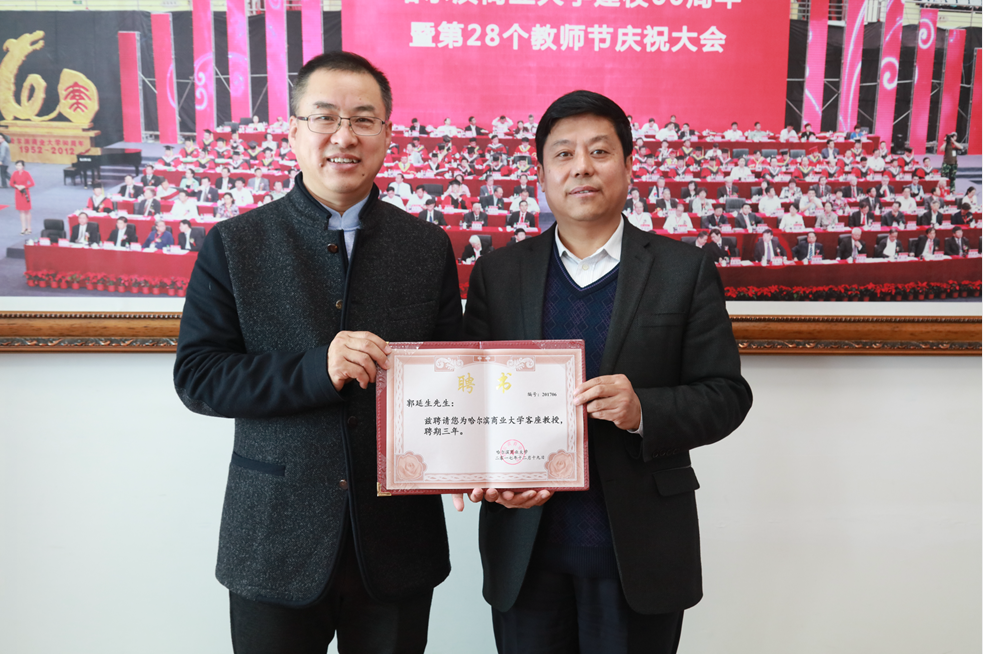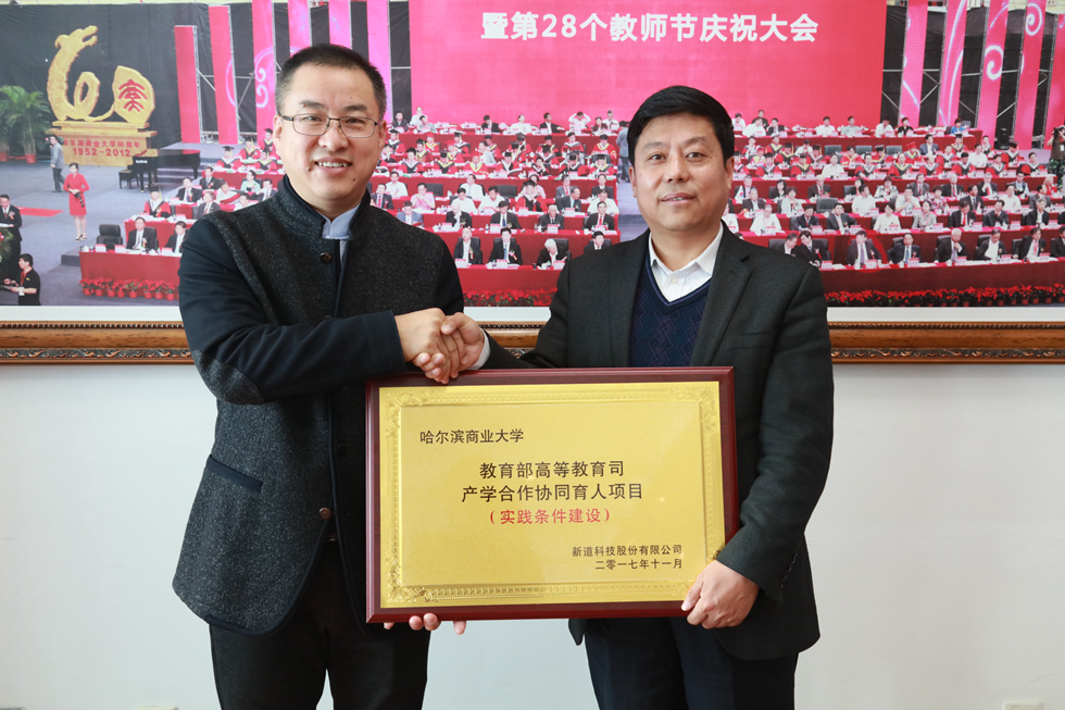 孙先民代表学校向郭延生颁发了聘书,聘请郭延生为哈尔滨商业大学客座教授。郭总裁新道科技股份有限公司向哈尔滨商业大学授予“教育部高教司产学合作协同育人项目”牌匾。