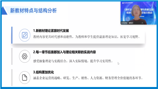 本次教材解读与竞赛经验分享会采用线上直播的方式,用新媒体的力量,让更多师生参与到虚拟教研室活动中,扩大了受众群体。现代企业商务运营课程虚拟教研室将持续打造“教材-课程-竞赛-就业”四维贯通的商科实践教学生态,举办更多的教研活动,在专业建设、课程改革、人才培养等方面为广大师生服务和助力,为新时代经管类人才培养注入新动能。