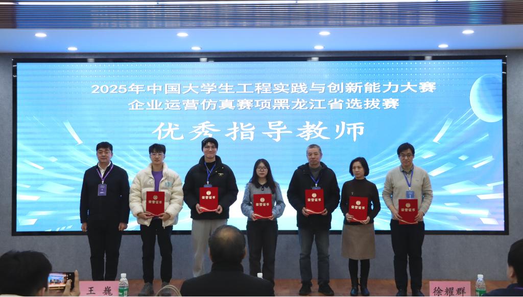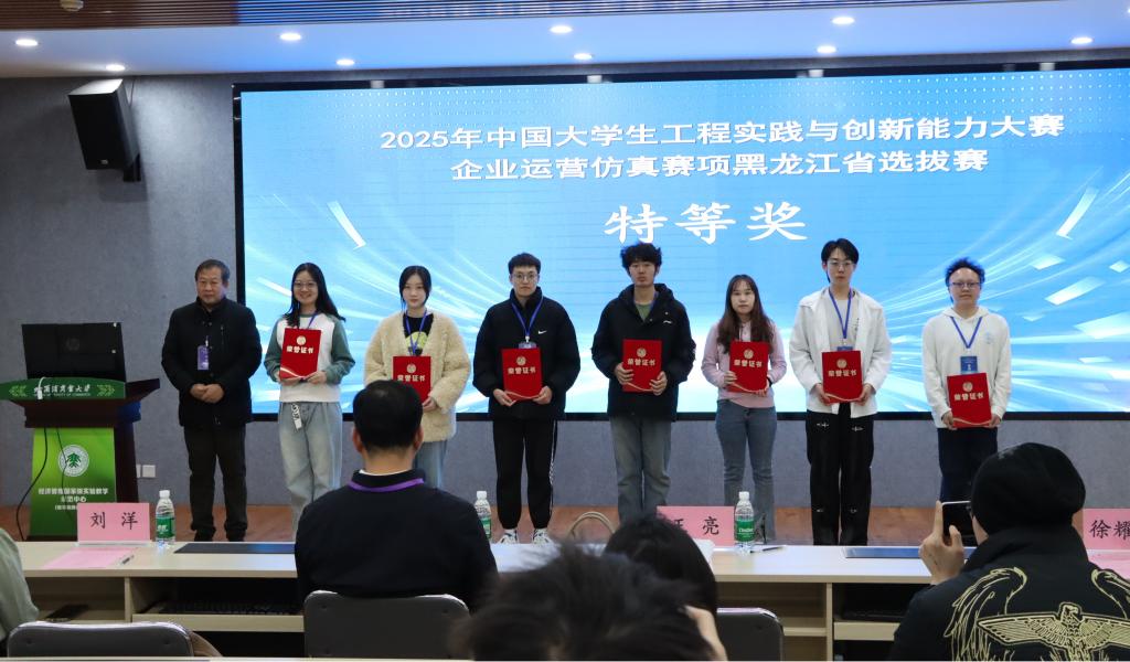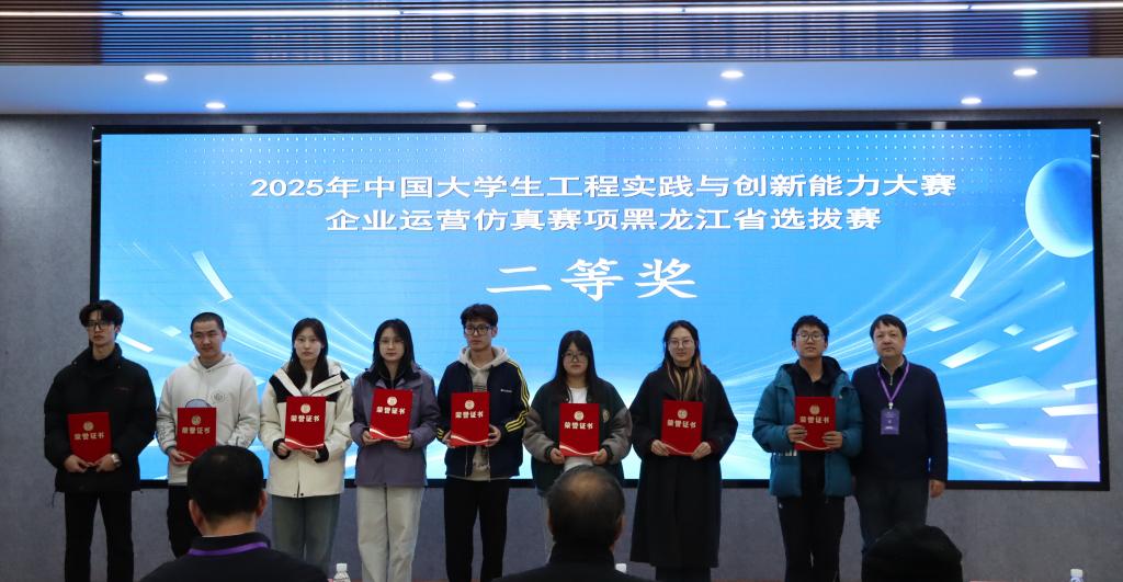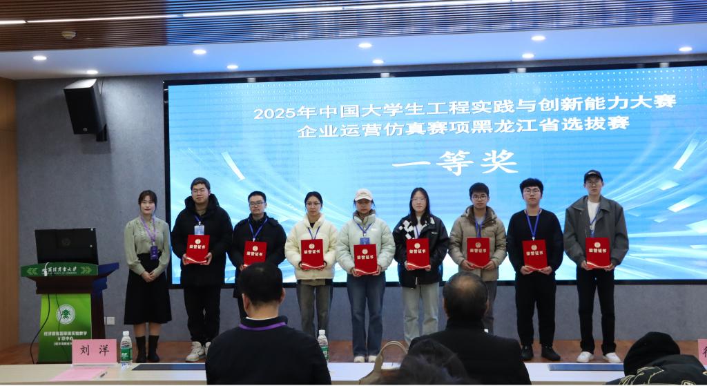3月29日,由黑龙江省教育厅主办、哈尔滨商业大学承办的2025年中国大学生工程实践与创新能力大赛企业运营仿真赛项黑龙江省选拔赛在我校举办。来自哈尔滨工业大学、哈尔滨工程大学等全省32所高校的142支参赛团队共计600余名师生参加大赛。我校党委常委、副校长王巍、2025年中国大学生工程实践与创新能力大赛省赛巡视员北京航空航天大学王亮、黑龙江省教育厅高等教育处刘洋、我校教务处处长徐耀群参加颁奖典礼并为获奖团队颁奖,颁奖典礼由教学实验设备管理中心副主任关祥毅主持。